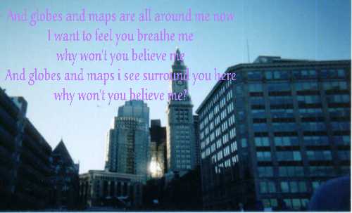 Globes and Maps by Something Corporate. I had this picture and I wanted to do something with it and then the song came and it seemed so perfect. I want to feel you breathe me. It's a view of Boston from the aquarium.